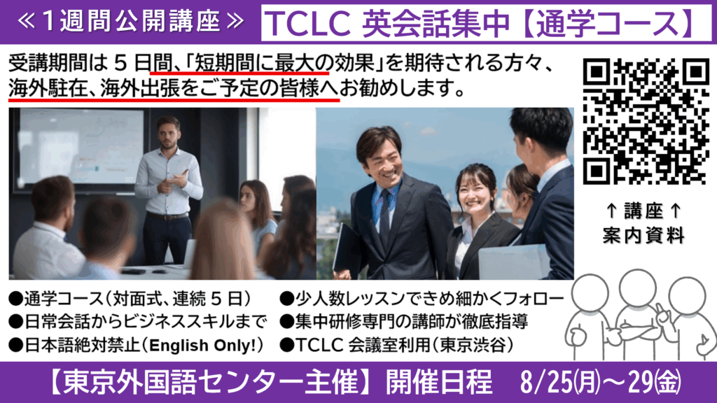 東京外国語センターは、公開講座「英会話集中【1週間・通学コース】」を対面式(於 東京外国語センター、渋谷駅 徒歩10分)で開催します。